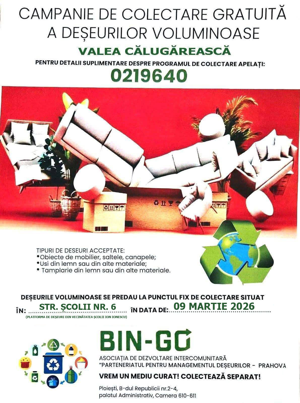 ♻️ Luna aceasta, în comuna noastră, se organizează o campanie de colectare a deșeurilor voluminoase, oferind posibilitatea de a elimina obiectele de mari dimensiuni ce nu pot fi preluate prin sistemul obișnuit de salubrizare.
